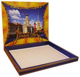 380х310 | Подарочный набор «Любимый город» (С-Петербург) Конструкция «моноблок» с объемными бортами. Дизайн всех плоскостей конструкции, фотосессия, авторская графика. Полноцветная печать + Пантоны, конгрев, фольга, УФ-лак. |